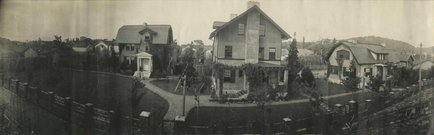 ウォーターハウス記念館の周辺に、1913(大正2)年に吉田邸とウォーターハウス邸、 翌1914(大正3)年にヴォーリズ邸、1921(大正10)年には旧近江ミッションダブルハウスが建てられ、そしてこれらの住宅に囲まれるようにテニスコートが設けられ、近江八幡市池田町に広大な洋館街を形成しました。現在、ヴォーリズ邸は取り壊され吉田邸とウォーターハウス邸、旧近江ミッションダブルハウス、旧近江八幡家政塾舎のみが残っています。